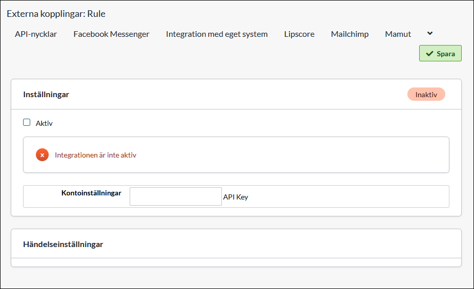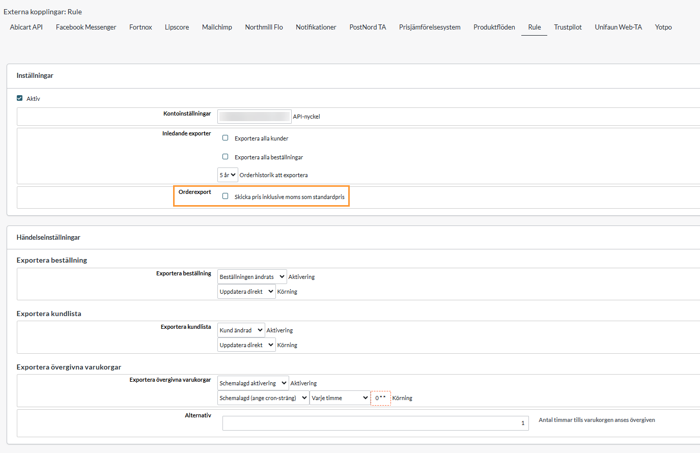 Aktivieren Sie das Kästchen Aktiv, fügen Sie dann den API-Schlüssel, den Sie in der Regelverwaltung erstellt haben, in das Feld "API-Schlüssel" ein und speichern Sie.