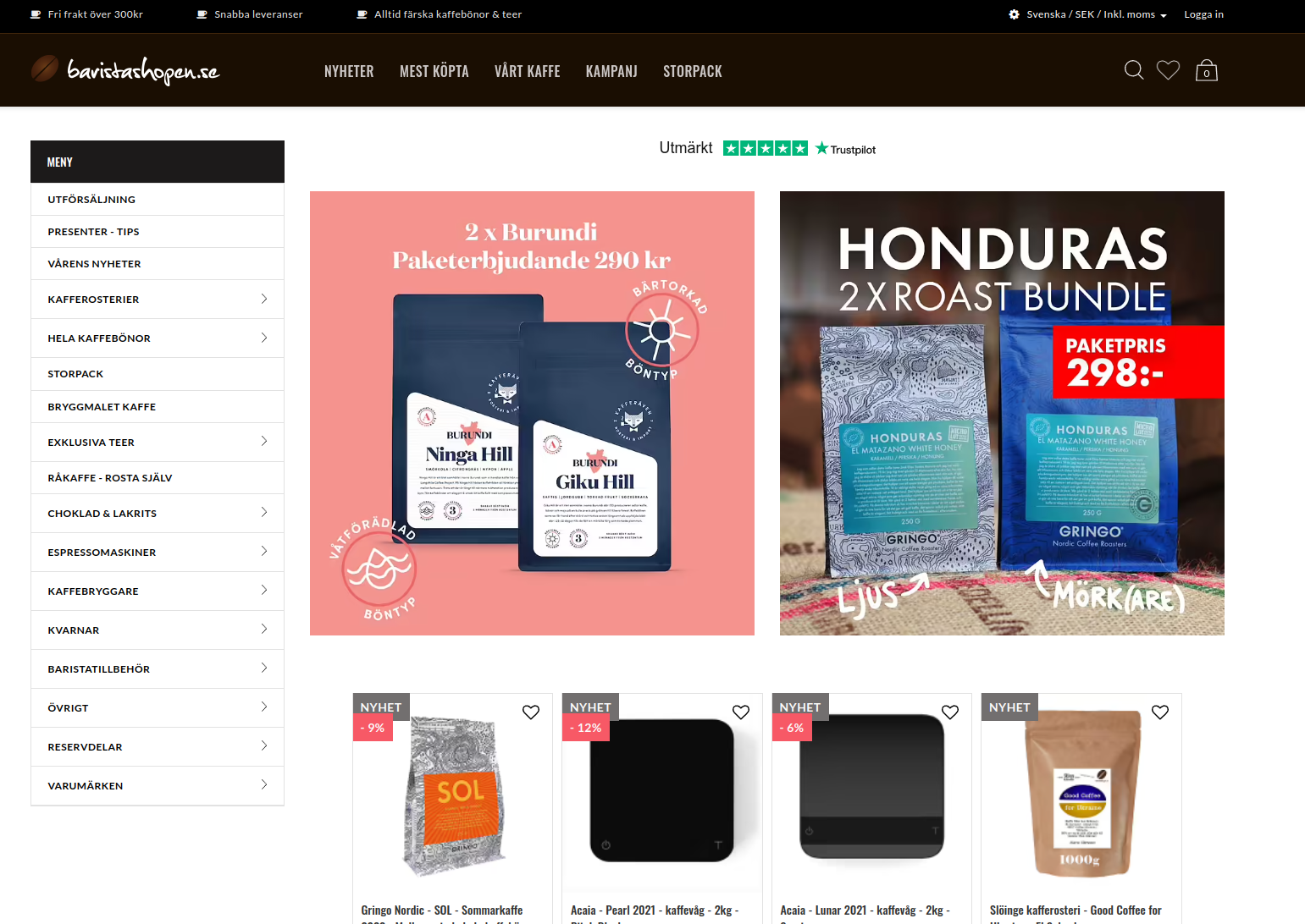 Frisch gerösteter Kaffee ist so viel besser! Baristashopen ist ein unabhängiger Anbieter von frisch gerösteten, datumsmarkierten Kaffeebohnen* Wir wollen allen ein besseres und frischeres Kaffeeerlebnis bieten und haben uns daher auf die Lieferung von frisch gerösteten Spezialitätenkaffeebohnen spezialisiert (Achtung: niemals neu verpackt, da dies die Haltbarkeit und Frische erheblich verkürzt). Die Haltbarkeit der Kaffeebohnen in der ungeöffneten Verpackung beträgt mindestens 9 Monate ab dem Röstdatum, wenn du Kaffee von Johan & Nyström kaufst. Kaffee von kleineren Röstereien verwendet keinen Stickstoff in den Beuteln und dieser Kaffee ist am besten, wenn er innerhalb von 3 Monaten nach dem Röstdatum konsumiert wird. Komm uns oft besuchen! Wir sind immer auf der Suche nach wirklich gutem, frisch geröstetem Bio-Kaffee, Tee und dem besten Zubehör. Der von Baristashopen verkaufte Kaffee stammt immer aus fairen Quellen. Die meisten Bohnen sind außerdem aus biologischem Anbau. *Wenn der frisch geröstete Kaffee von uns verschickt wird, sind selten mehr als 30 Tage seit dem Rösten der Kaffeebohnen vergangen. Die Haltbarkeit der Kaffeebohnen in der ungeöffneten Verpackung beträgt mindestens 9 Monate ab dem Röstdatum. Dies ist einer einzigartigen Technik zu verdanken, bei der die Bohnen direkt nach dem Rösten in einer Schutzatmosphäre verpackt werden, in der maximal 0,05% Sauerstoff enthalten sind. Dies hält den Alterungsprozess maximal auf und ist eine enorme Verbesserung gegenüber früheren Verpackungstechniken. Wenn du mehr als 300:- bestellst, zahlen wir den Versand. Bitte beachte, dass Baristashopen ganze Kaffeebohnen verkauft und du eine Mühle brauchst, um sie zu mahlen. Die Kaffee- und Espressomaschinen und -mühlen, die wir verkaufen, sind von höchster Qualität und wurden von unserem Testpanel sorgfältig geprüft. Außerdem bieten wir eine sorgfältig getestete Auswahl des besten Zubehörs auf dem Markt an, damit du als Barista erfolgreich sein kannst. Der Shop wird ständig mit neuen Röstungen und Zubehör aktualisiert. Wenn du sichergehen willst, dass du nichts verpasst, wenn z.B. eine Limited Edition" Kaffee in den Barista-Shop aufgenommen wird, dann melde dich für unseren Newsletter an: Schicke eine E-Mail an info(at)baristashopen.se und melde dein Interesse an. Willkommen zum Bestellen!"