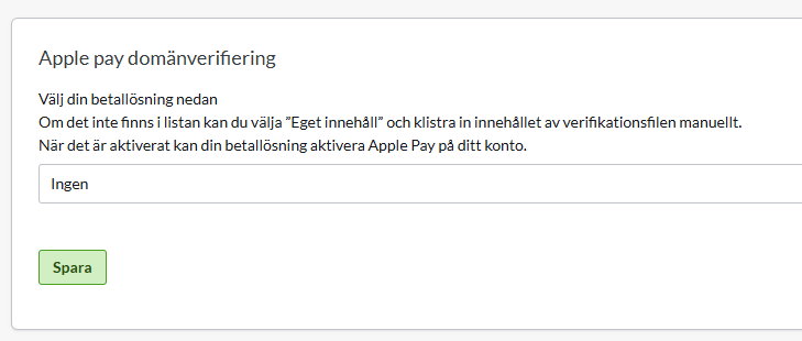 We do not offer a separate payment method for Apple Pay, but it can be used in-store via other payment solutions. Currently we support Apple Pay through Nets Easy, Stripe, Swedbank Pay and Svea Checkout.