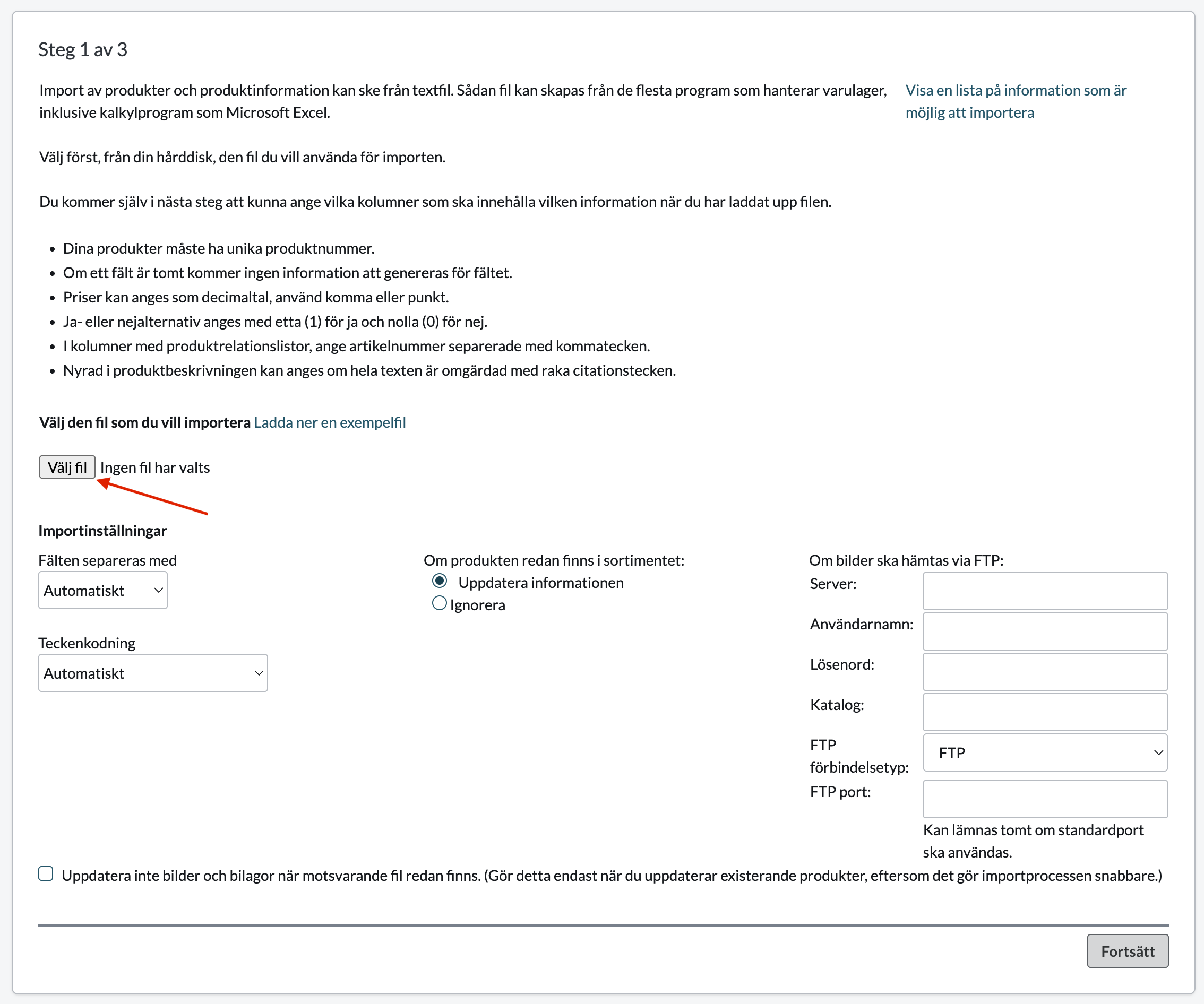 Here we have selected the column content for each column in our import file: Product number, Product name (sv) and Related products → Similar products.
