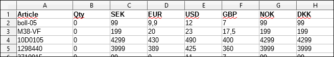 Edit the file so that it looks like the image below. Then import the file into the price list in admin again.