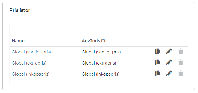 Normally, three different price lists will be created, one for regular price, one for extra prices and one for purchase prices. If no product has an extra price or purchase price, only one price list is created, Global (regular price).