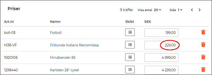 In the example above, the unit price will be SEK 220 if you buy one or two items. If you buy three or more, the unit price will be 120 SEK.