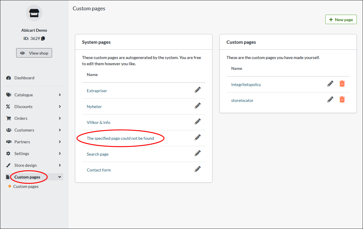 Under "Custom pages" there is a default page called "Specified page could not be found". It appears when a visitor lands on a page that no longer exists. Click on the page to edit the content.