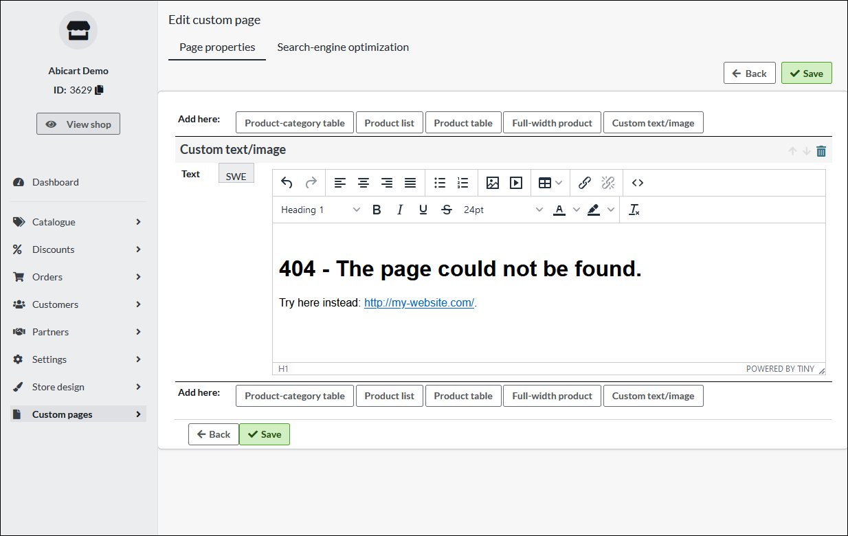 A tip is to always include a link to the shop's home page so that the visitor can easily move on and look for similar products via the shop's search function or by navigating the menu.
