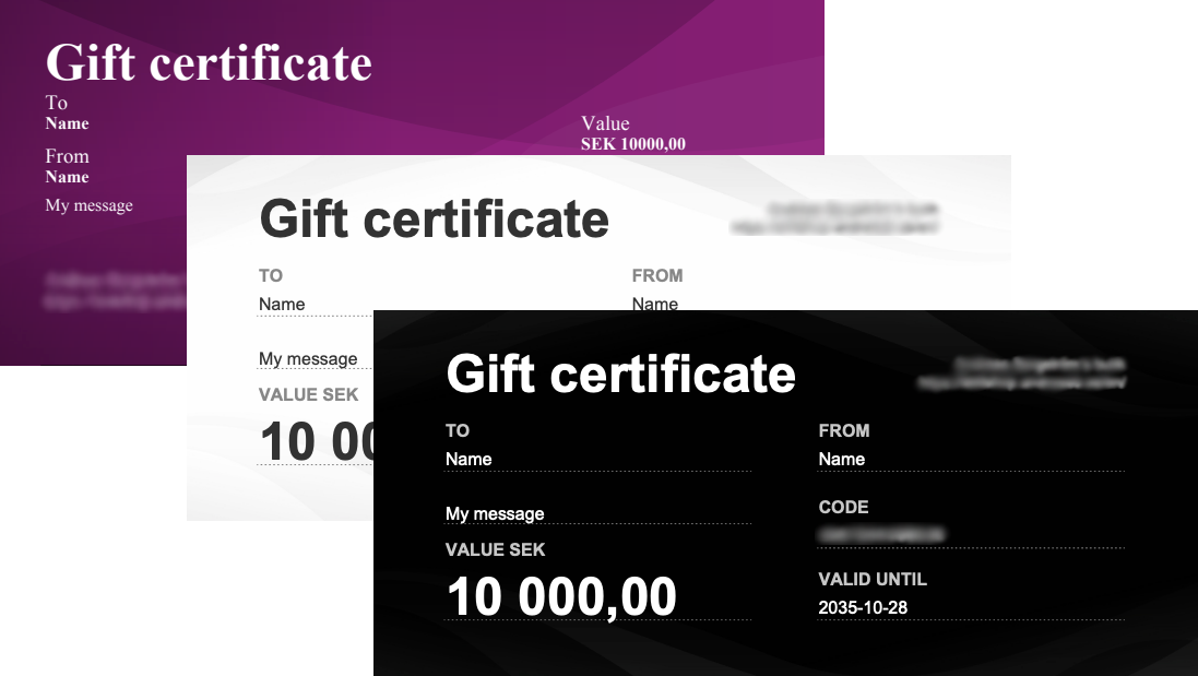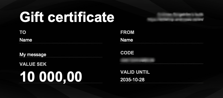 Create gift card products via admin and let your customers buy gift cards in your webshop. When the order with the gift card is marked as paid in admin, an automatic email is sent to the buyer or recipient. Then they receive the gift card as a PDF.