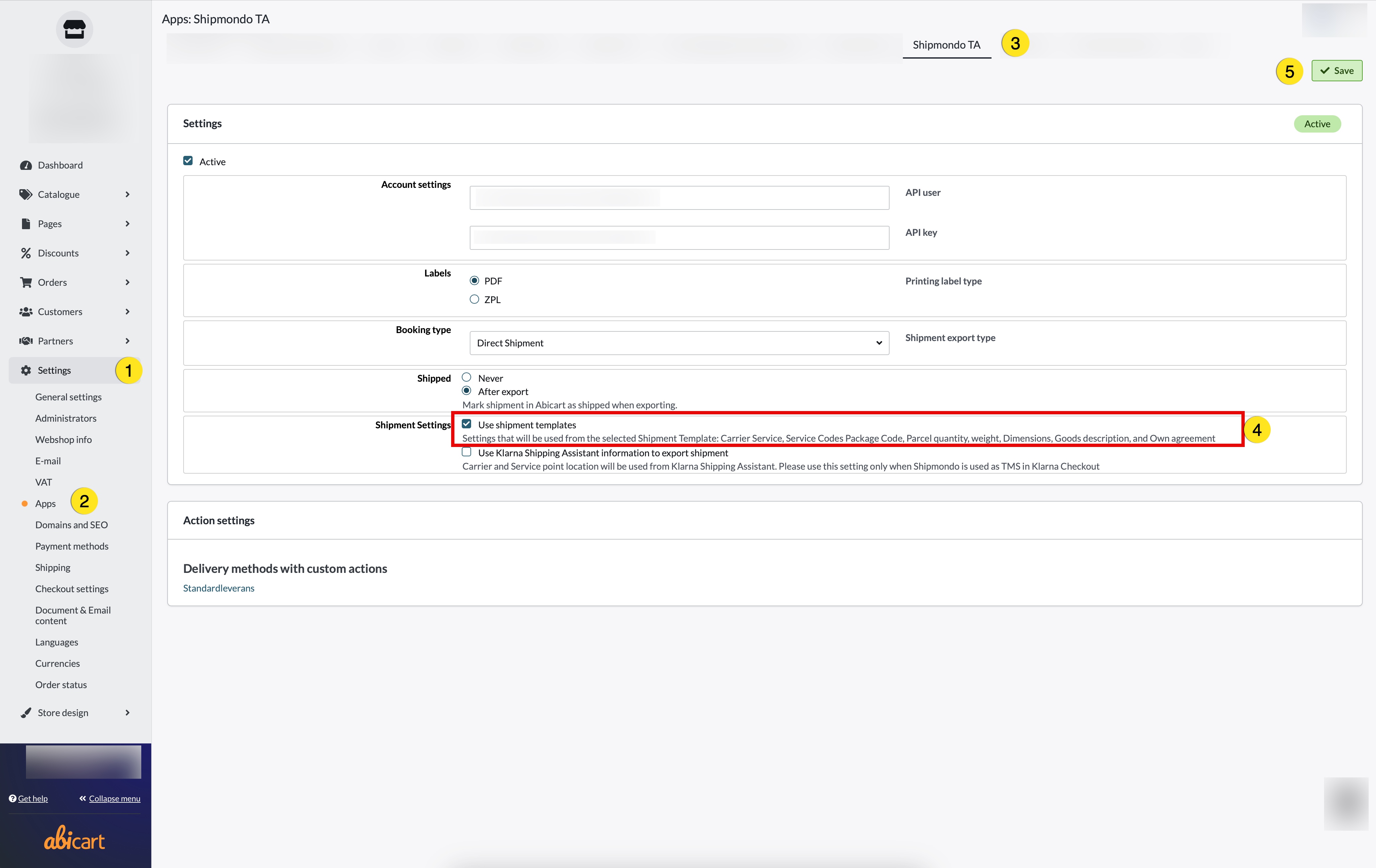 Activate Shipping Templates in Abicart (Settings → External Connection → Shipmondo TA).
