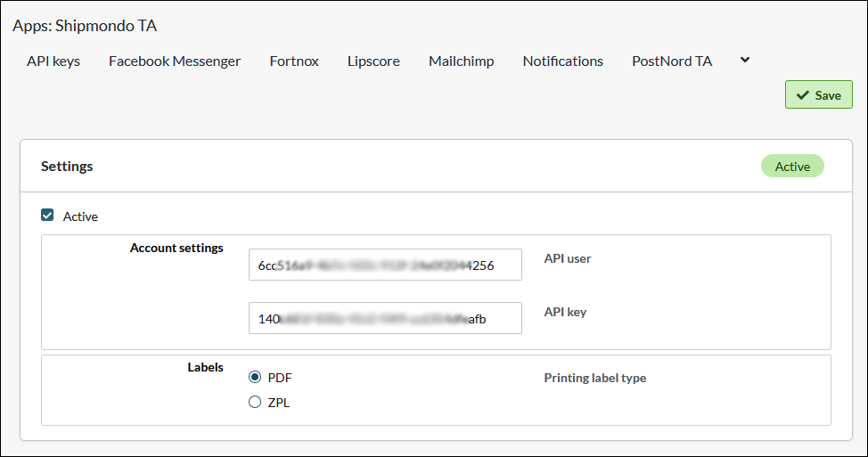 API Keys - Enter information from the field "API Keys" in Shipmondo.