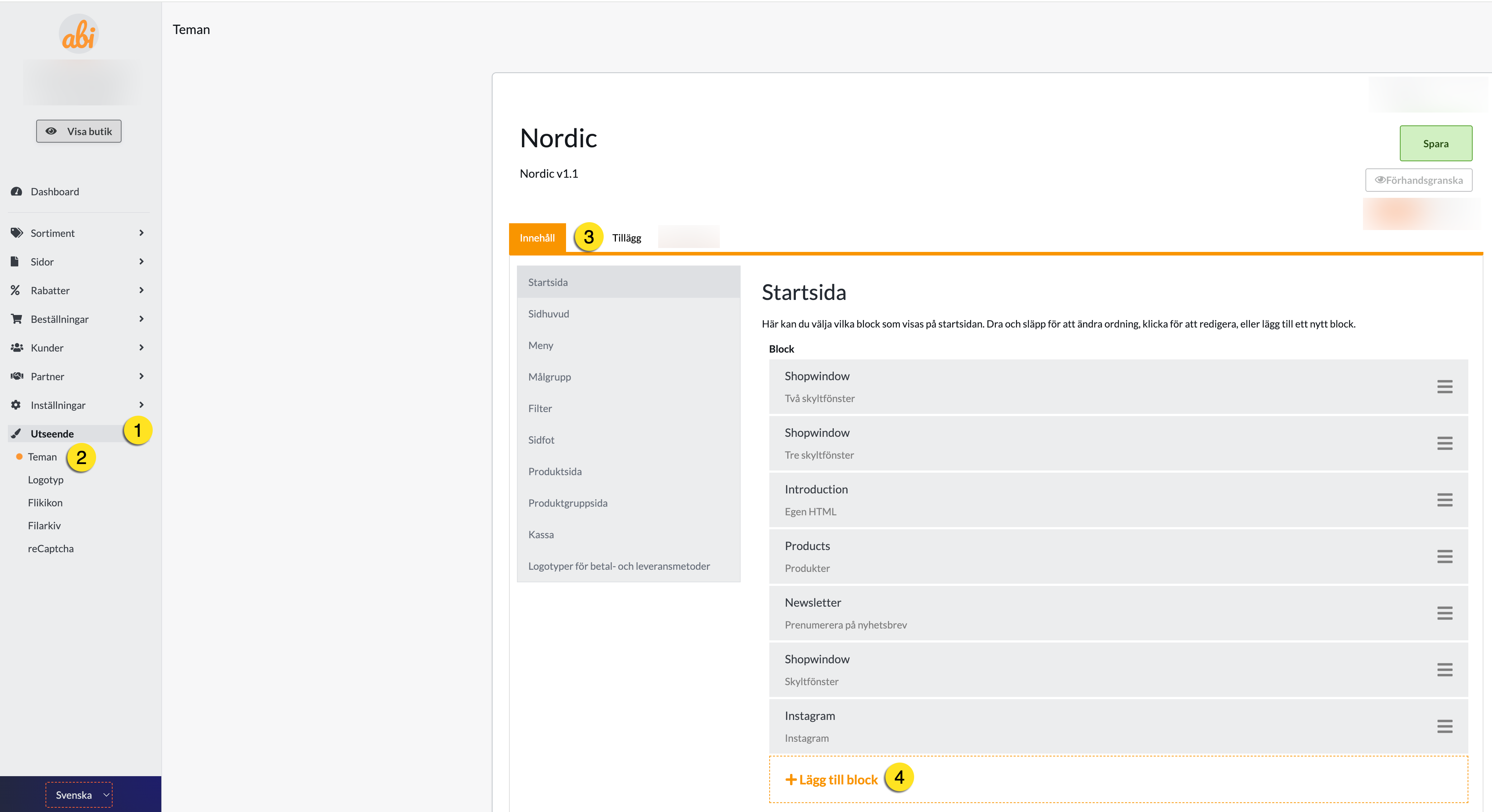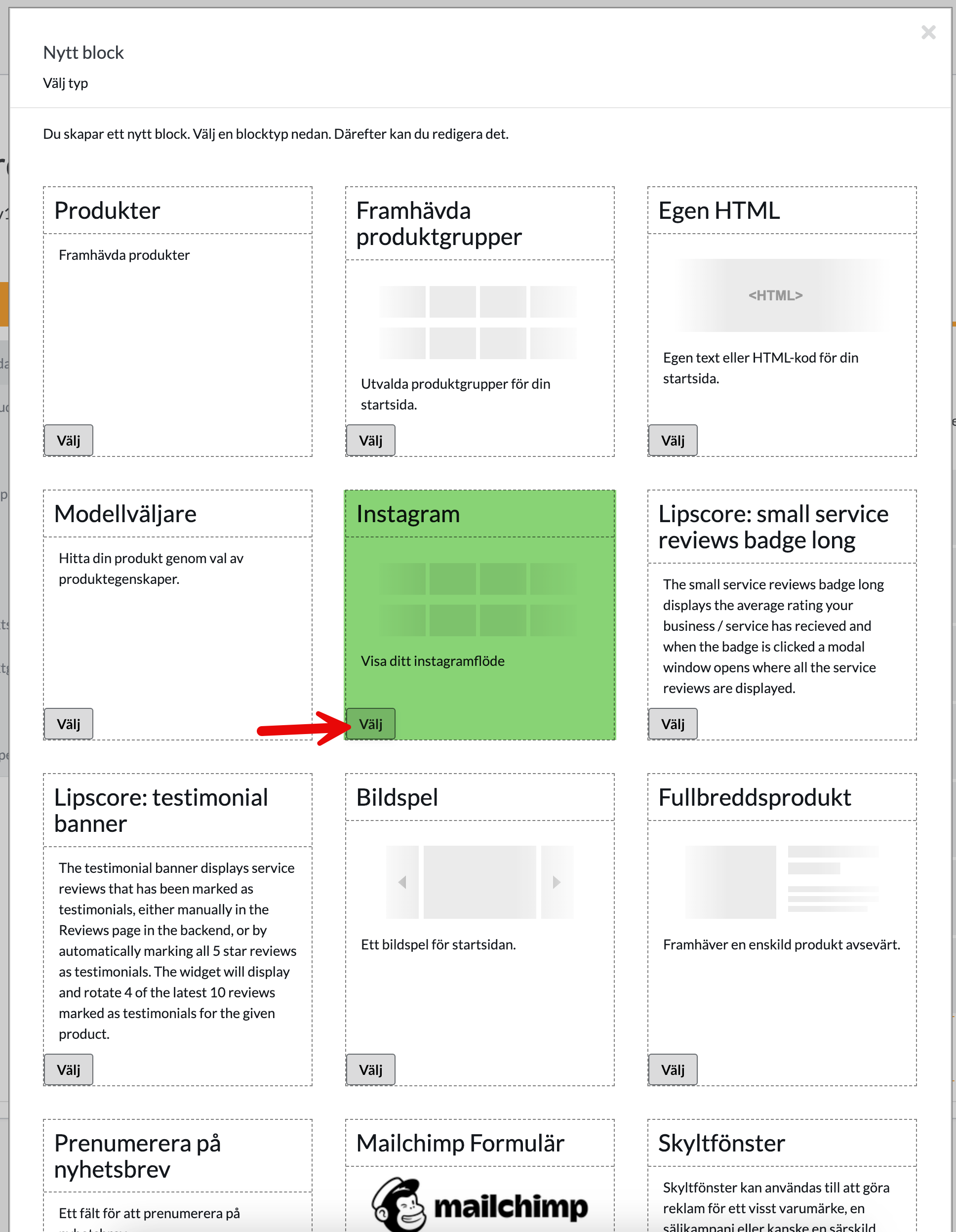 Utseende → Teman → Redigera → Innehåll → Lägg till block → Instagram