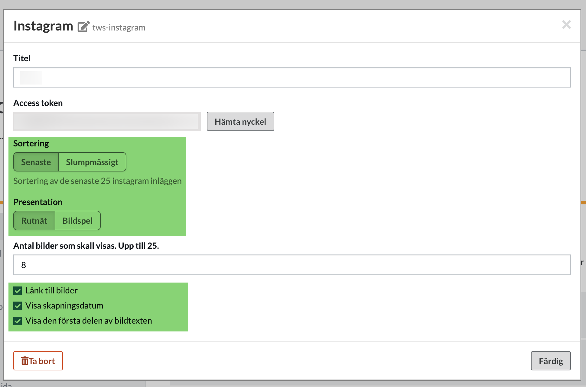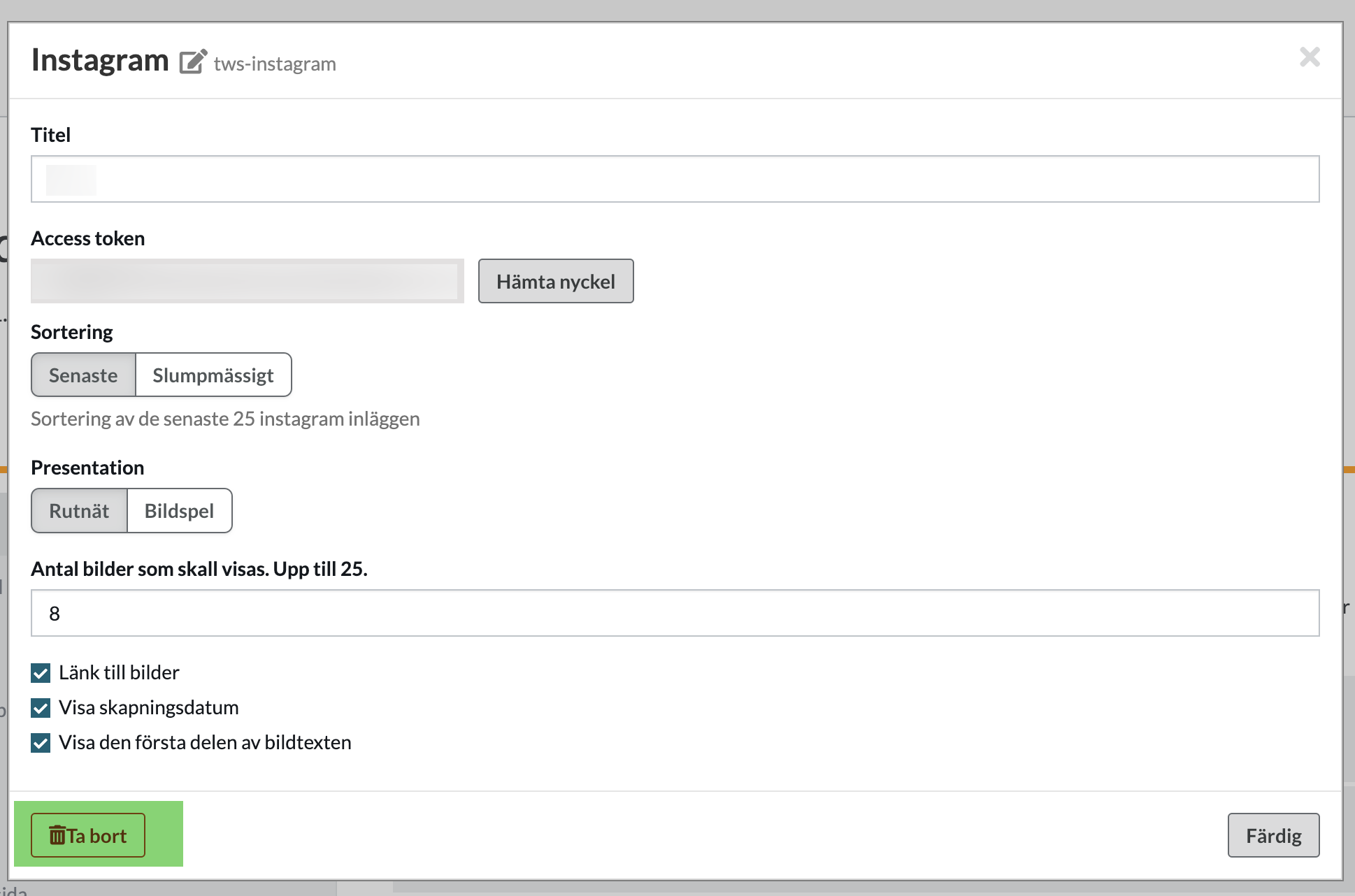 - Länk till bilderna: Länkar inläggen direkt till Instagram. När du klickar på en bild öppnas inlägget i Instagram.