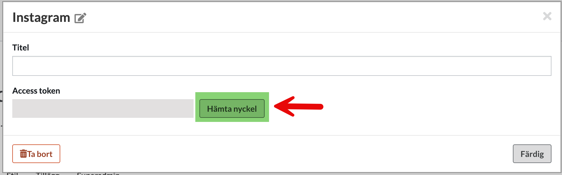 Ett Access token är giltigt i 60 dagar. Därefter behöver du "hämta nyckel" på nytt, se steg 2 nedan.