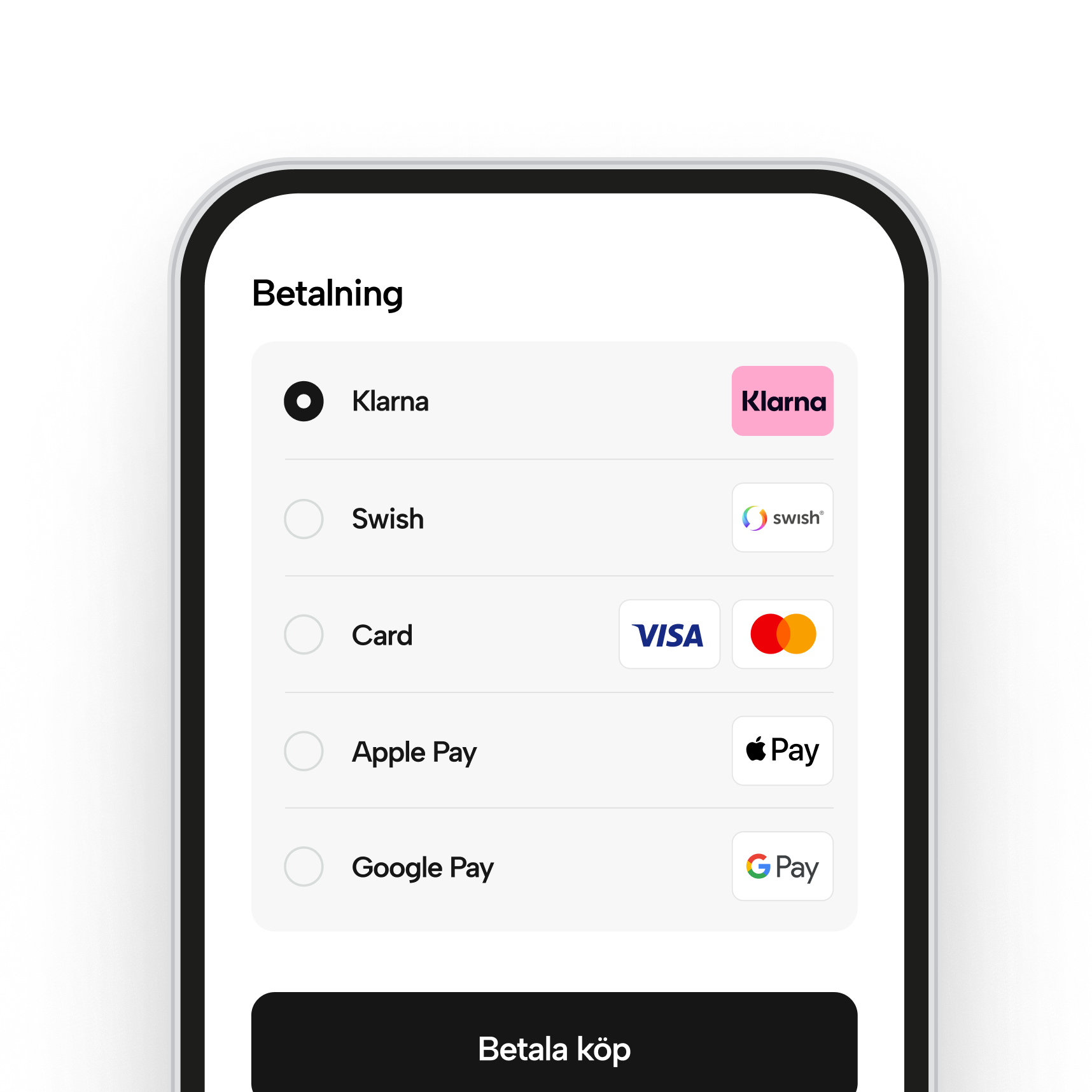 | Betalningsmetoder | Kort, banköverföring, Klarna, Swish, Apple Pay, MobliePay + 100 till |