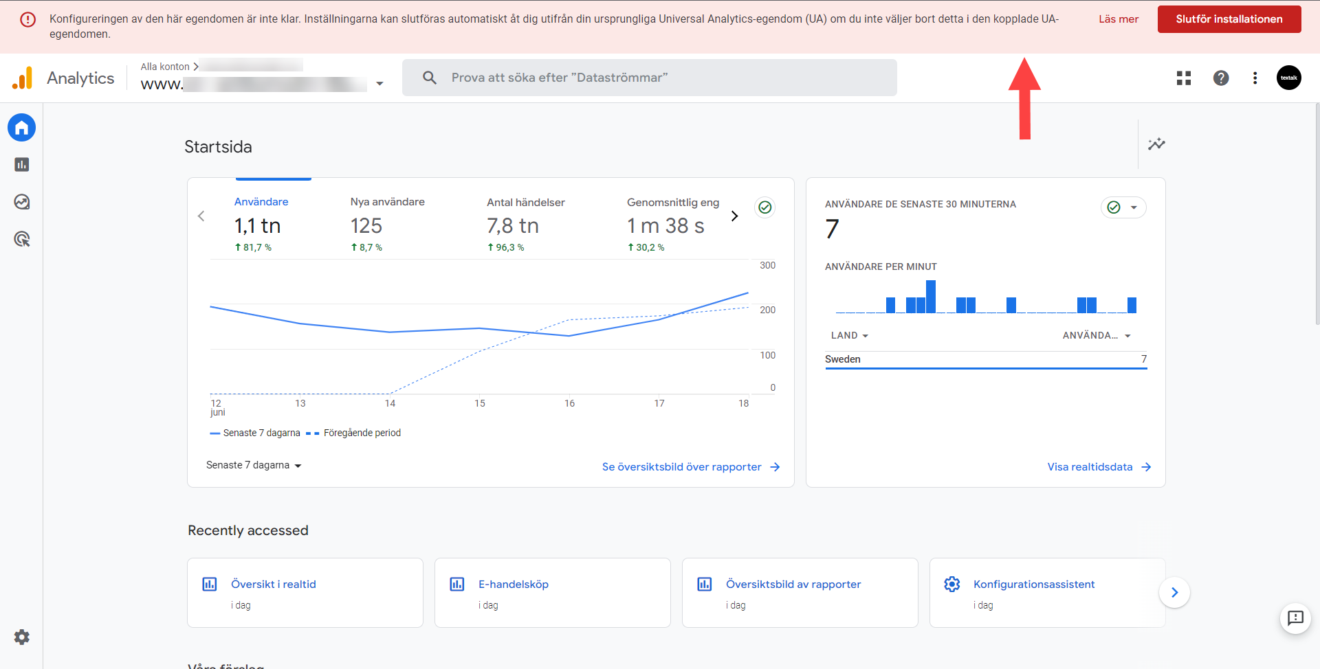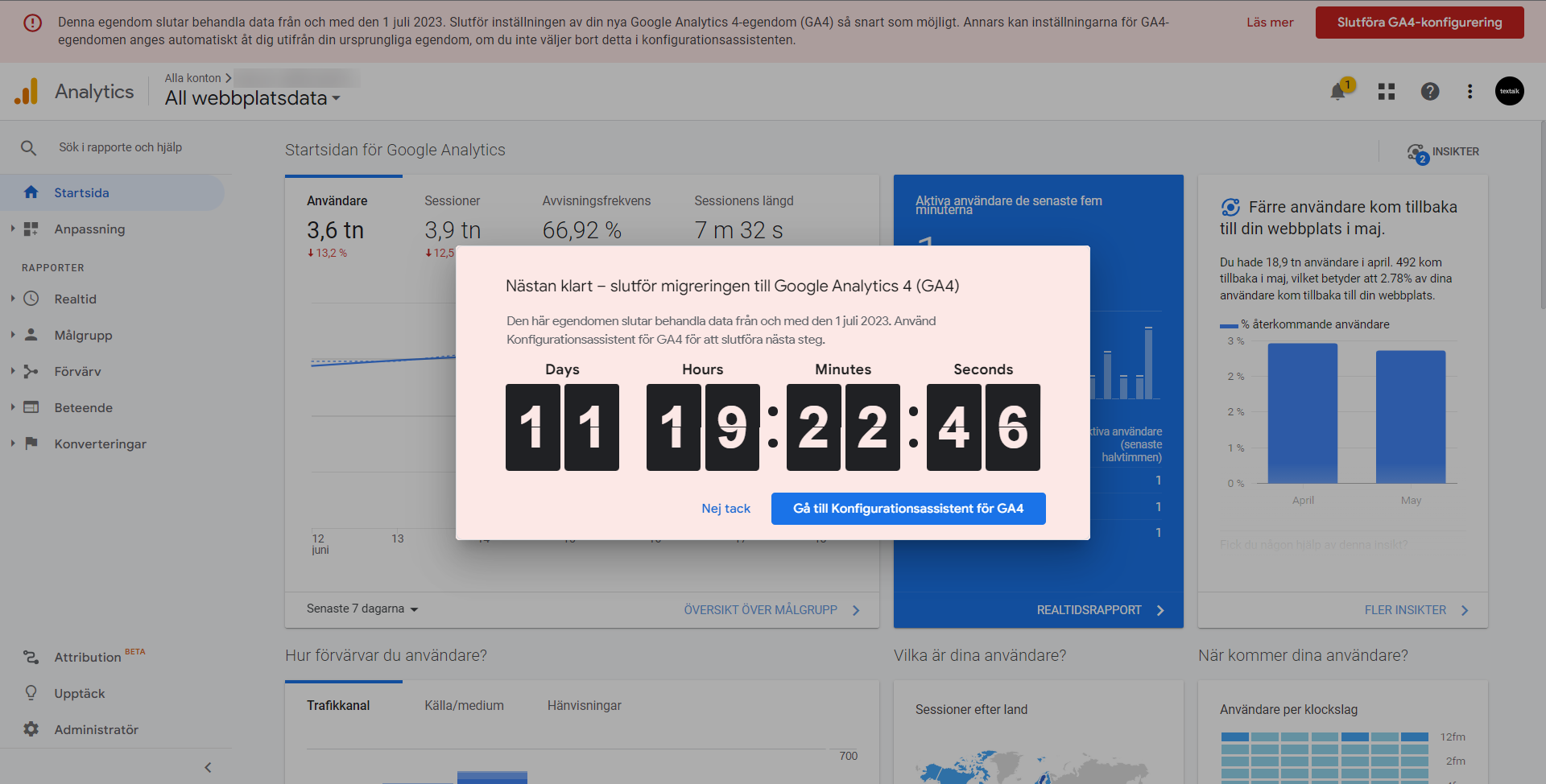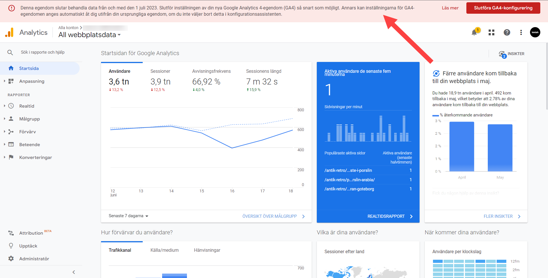 Den röda textrutan högst upp på sidan i Google Analytics som uppmanar till att byta till GA4 är ett standardmeddelande som Google visar oavsett om du har börjat använda GA4 eller inte.