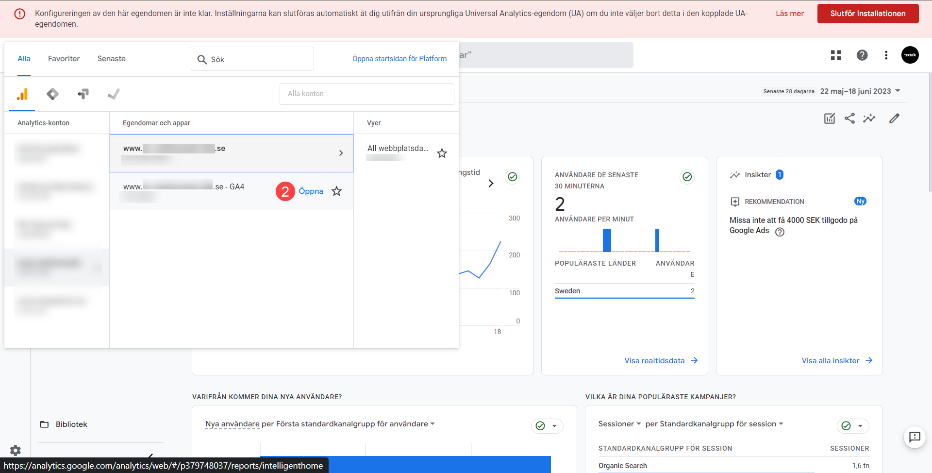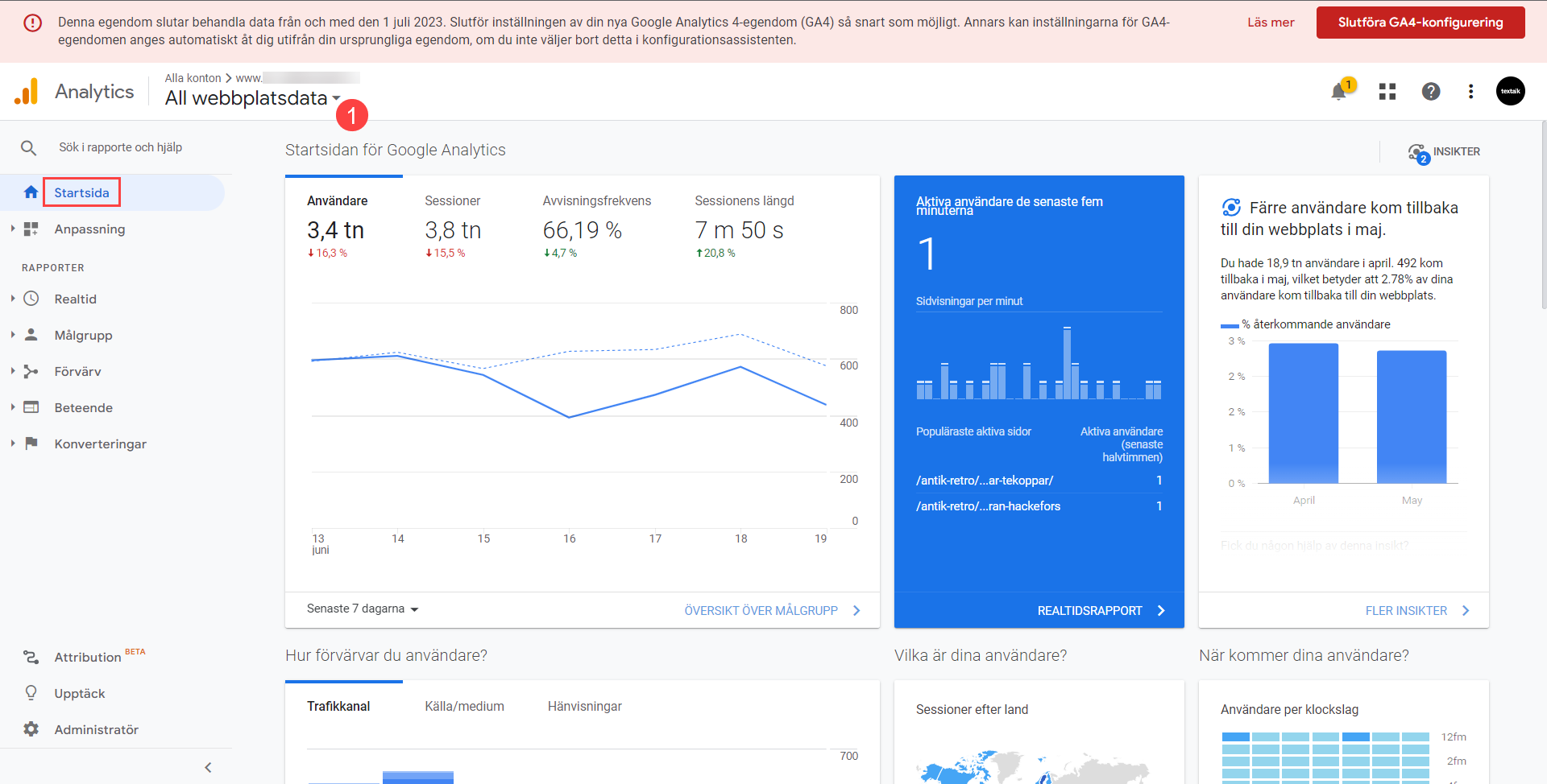 När du börjar på startskärmen kan det vara så att du befinner dig i UA-delen av Analytics. Därifrån klickar du (1) på "All webbplatsdata"
