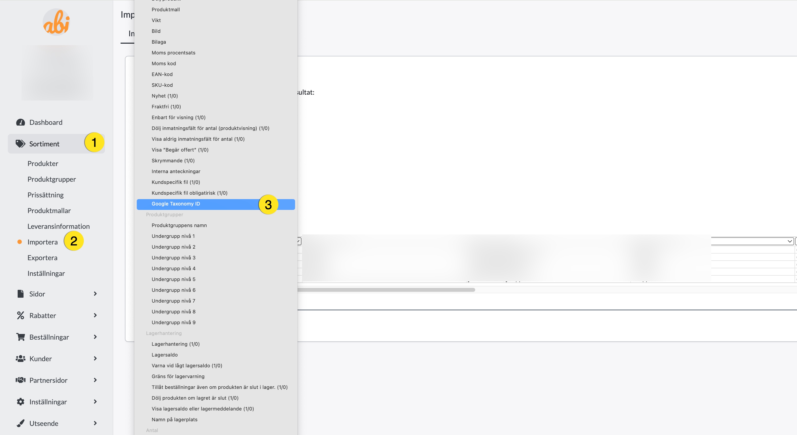 - Skapa en importfil med kolumnerna produktnumer och google taxonomy och importera för massuppdatering.