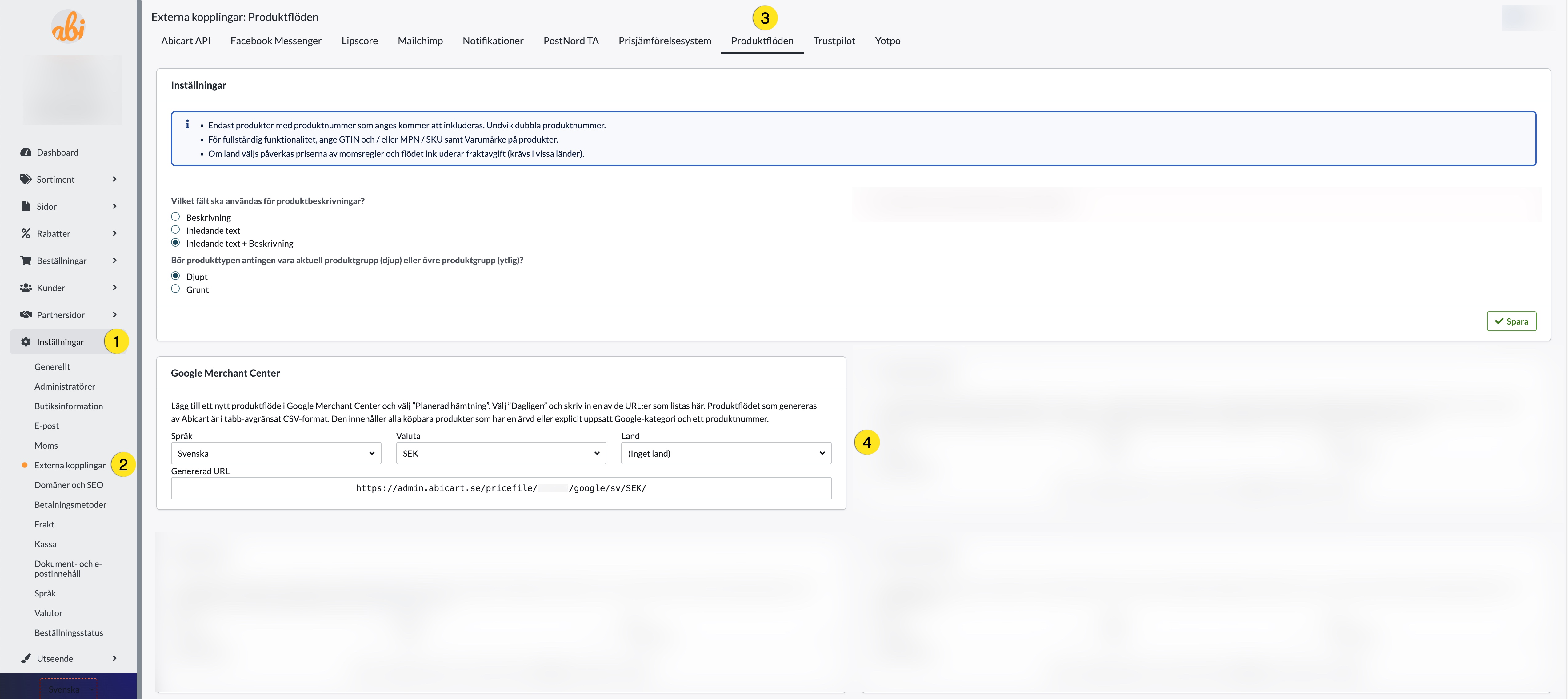 - Gå till Inställningar → Externa Kopplingar → Produktflöden → Google feed