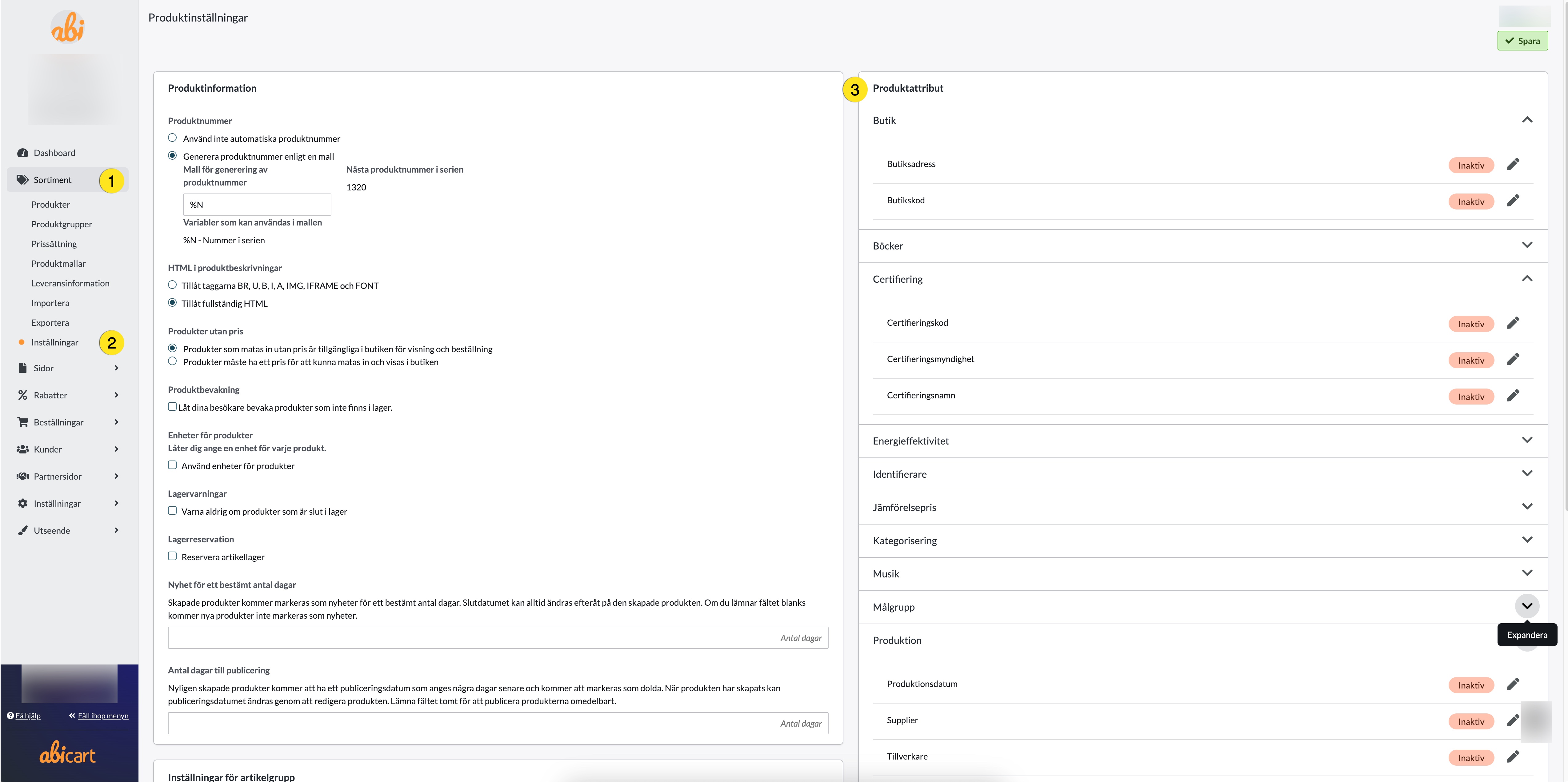 Om du behöver ytterligare attribut (t.ex. store code, store address, certificates), gå till Sortiment → Inställningar → Produkt attribut.