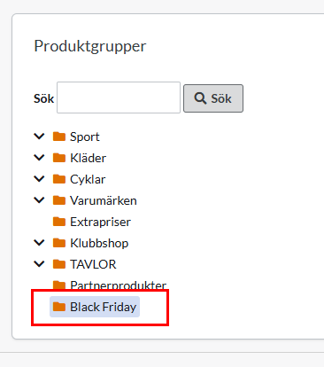 Om man vill snabbt ändra extrapris på en specifik artikelgrupp finns det en funktion för detta. Skapa en ny artikelgrupp, i detta exempel har vi döpt den till "Black Friday". Vi lägger sedan till produkter i gruppen som ska ha ett nytt extrapris.