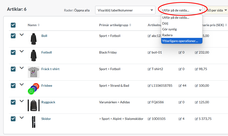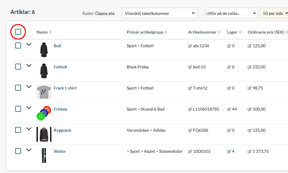 Kryssa i rutan ovanför den översta produkten så kommer alla produkter markeras.