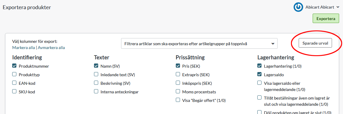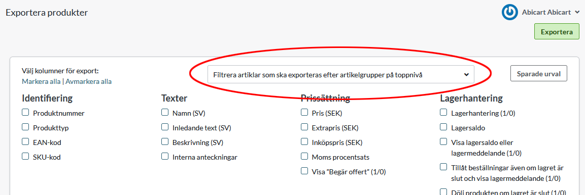 Filtrera produkter innan export - Det finns en droplista där man kan göra ett urval innan man exporterar. Kryssa i den eller de produktgrupper du vill exportera.Det sedan endast produkterna som tillhör de markerade grupperna som kommer exporteras.
