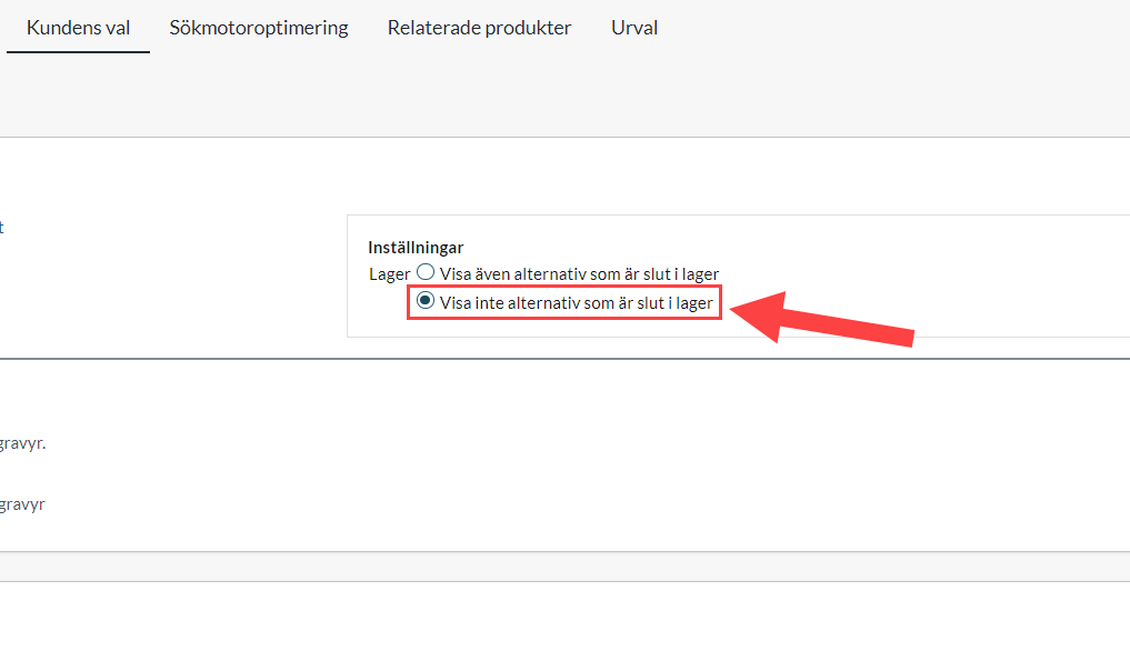 Inställningen "Visa inte alternativ som är slut i lager" fungerar oavsett antal "Lägg till valmöjlighet" när kundens val utseendet är inställt på "varianter". Detsamma gäller inte utseendet "valmöjlighet": Om du har fler än en "Lägg till valmöjlighet" och visar kundens val som "valmöjlighet kommmer alla produkter visas i rull-listan; även om är slut i lager.