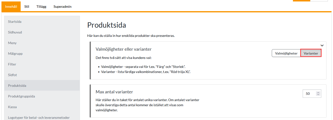 Om man vill kunna anger lagersaldo, artikelnummer eller kunna koppla en bild till varje val så aktiverar man det här. I vårt exempel vill vi ha lagersaldo på de olika färgerna så vi kryssar i denna rutan.