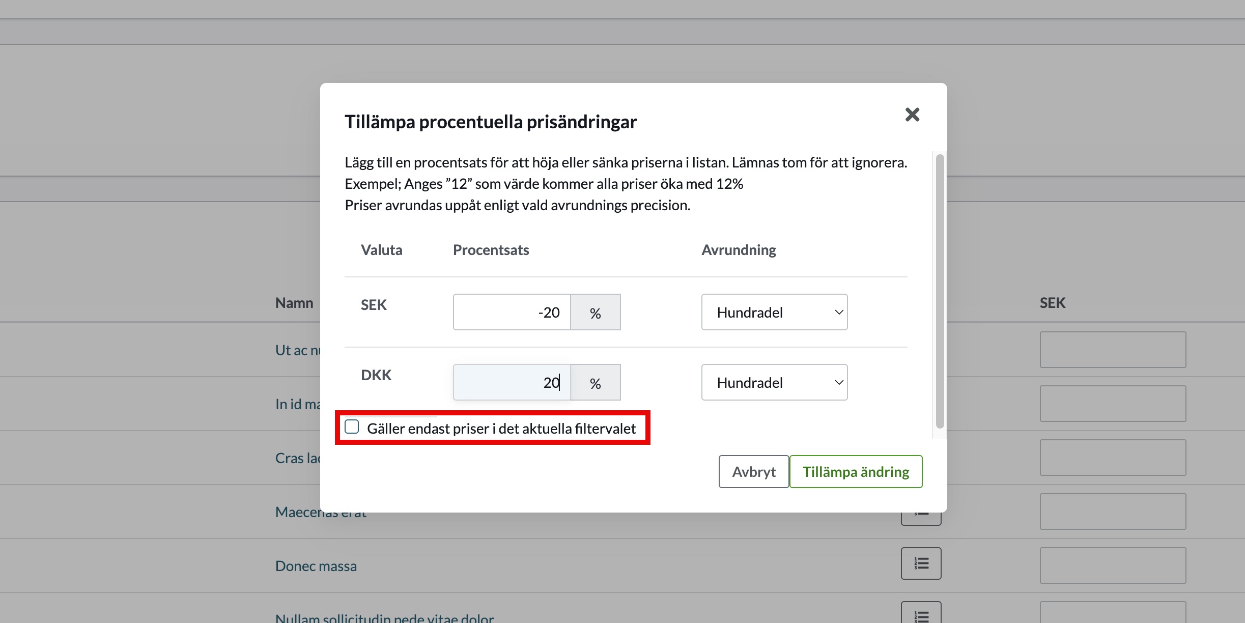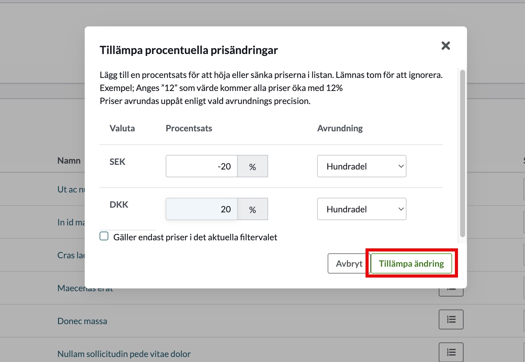 Använd detta alternativ om du vill höja eller sänka priser för en hel produktgrupp eller alla produkter.