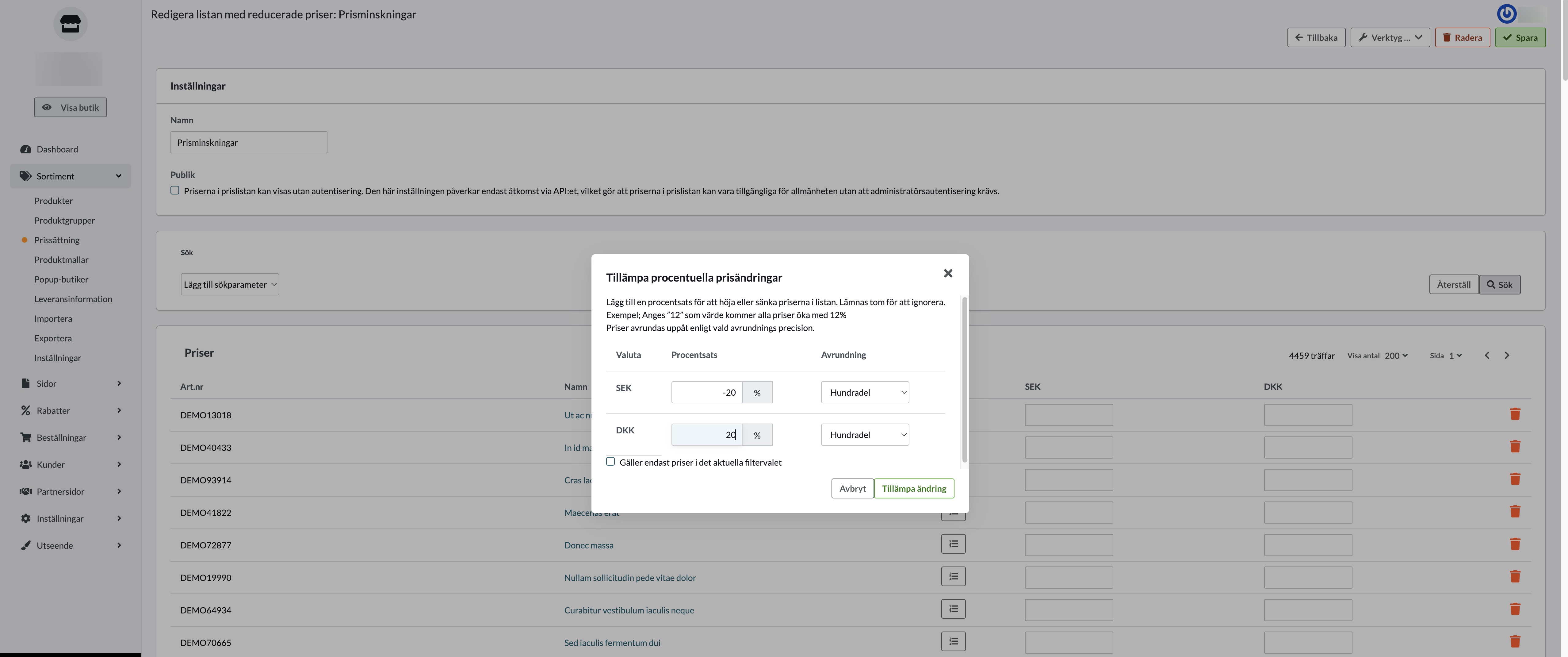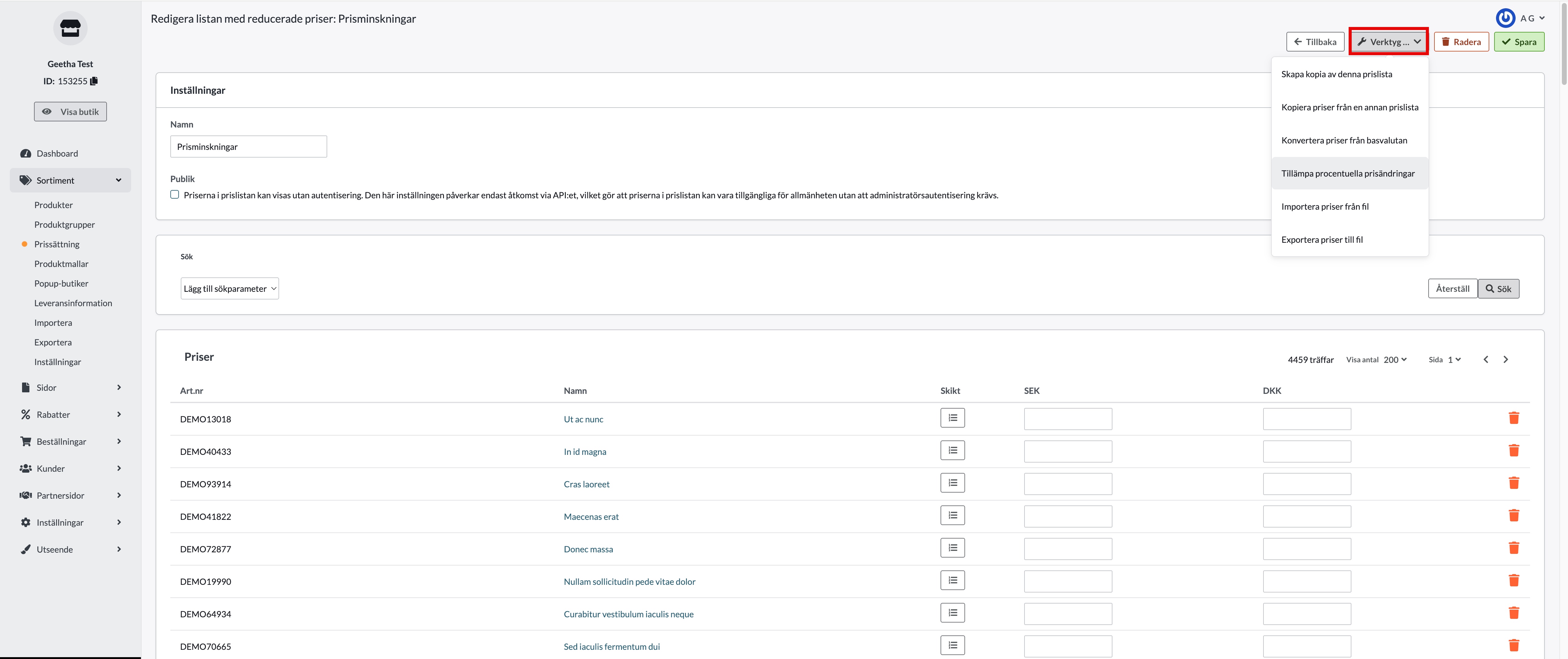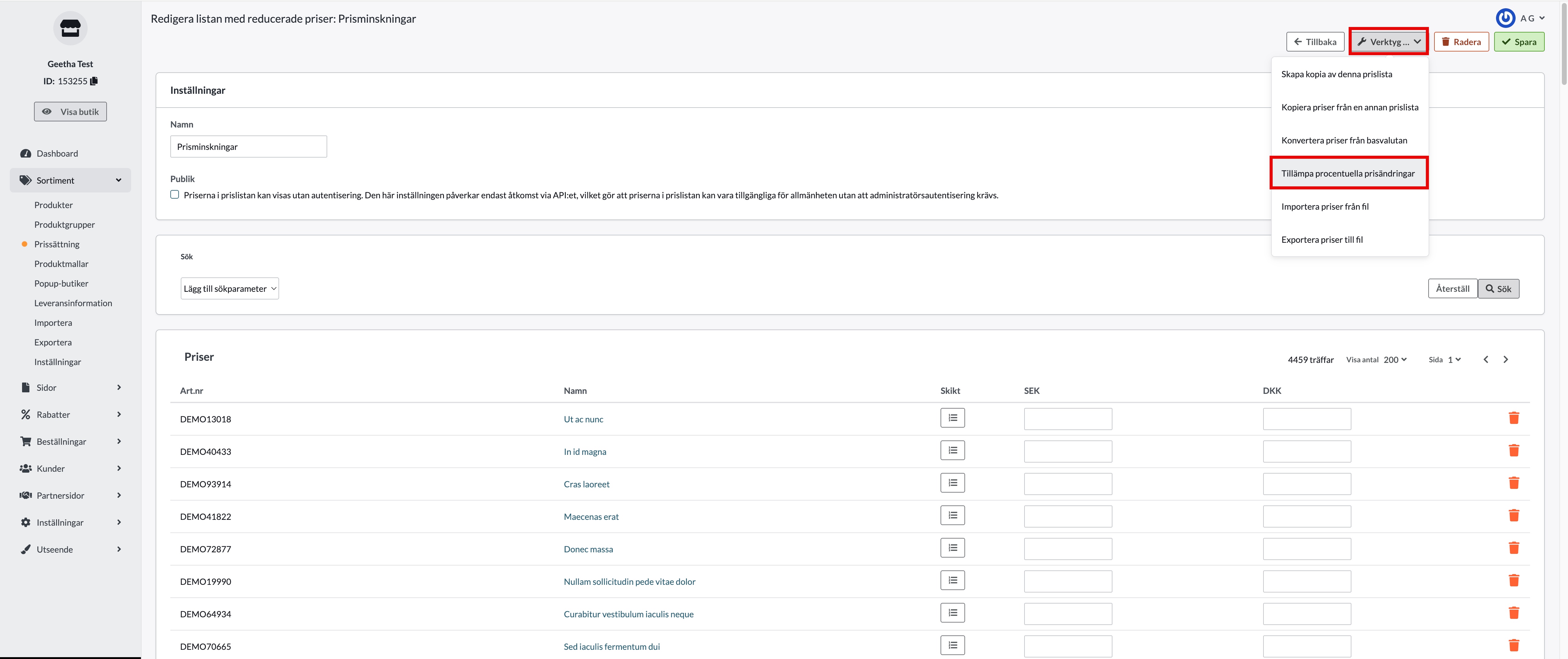 Alternativ 2: Massändring via Sortiment → Prissättning