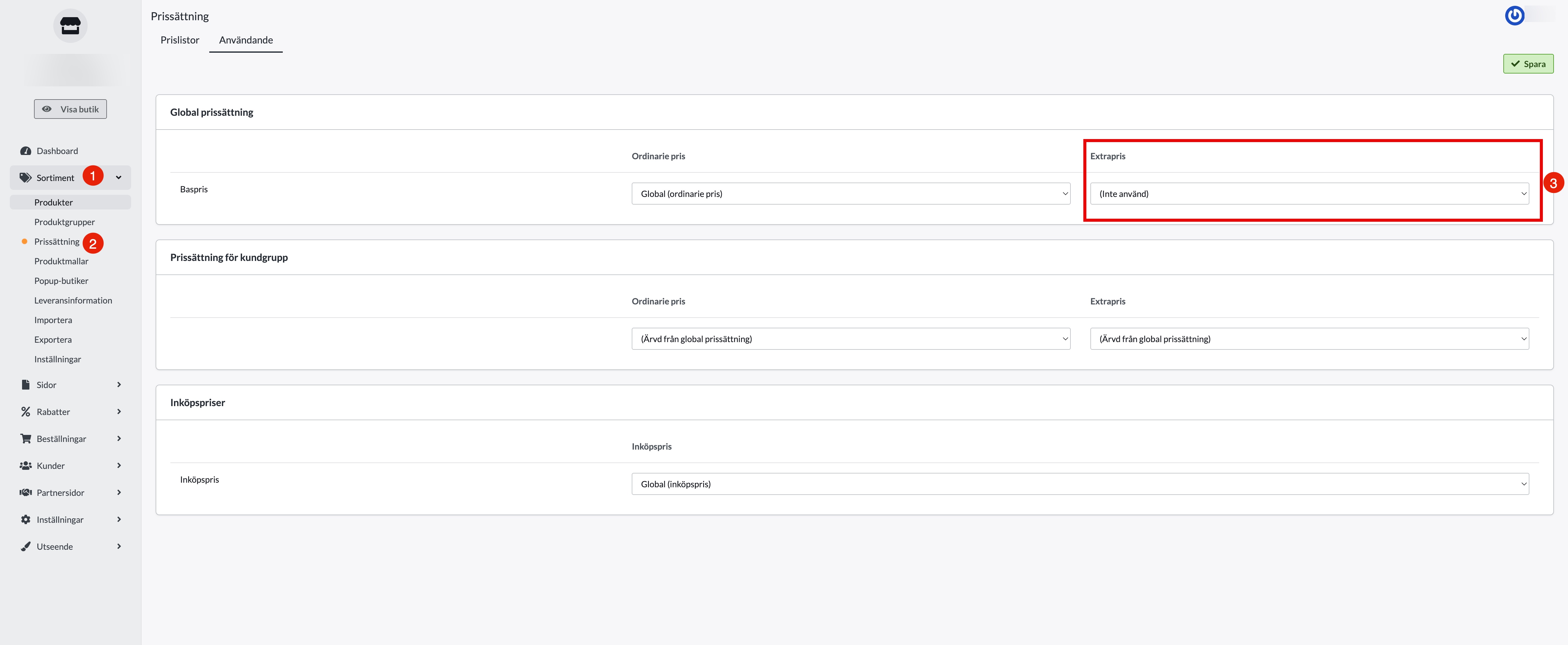 - Gå till Sortiment → Prissättning → användning.