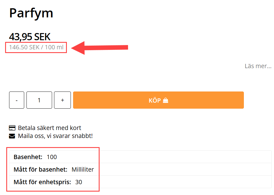 Om fel jämförelsepris visas behöver du ändra de värden du angivit för basenhet eller mått för enhetspris.
