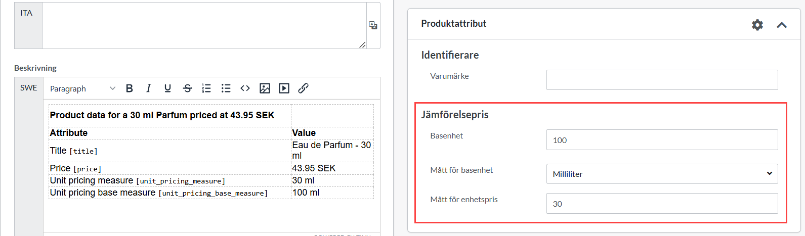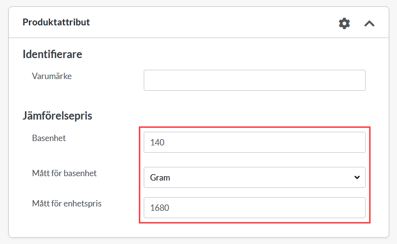 Gör attributet publikt och ange endast ett standardvärde för dess tre inställningar om du vill ha jämförelsepris på alla produkter. Om du inte vill ha jämförelsepris på alla prdoukter anger du inget standardvärde. Redigera istället varje produkt var och en för sig och ange korrekt basenhet och värde.